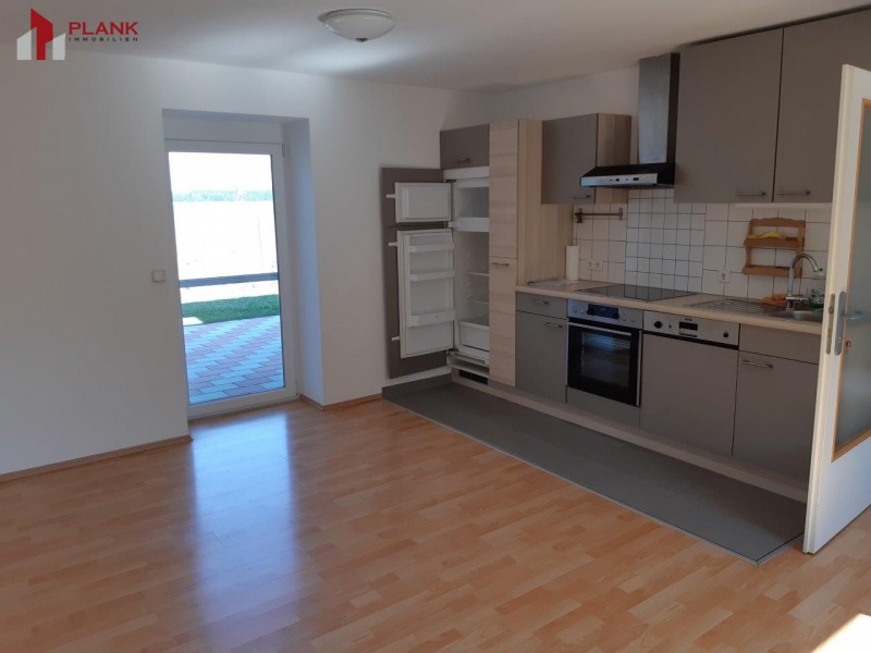 Wohnung 2: Vorraum, Bad mit WC, offene Küche mit Wohnbereich, Schlafzimmer, Terrasse.