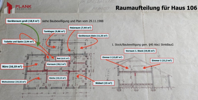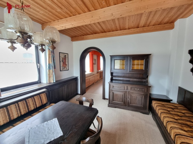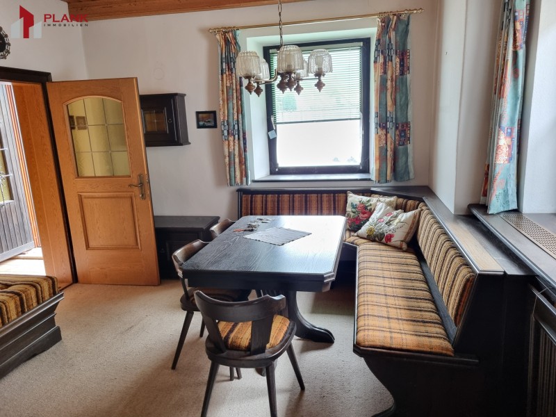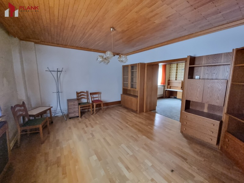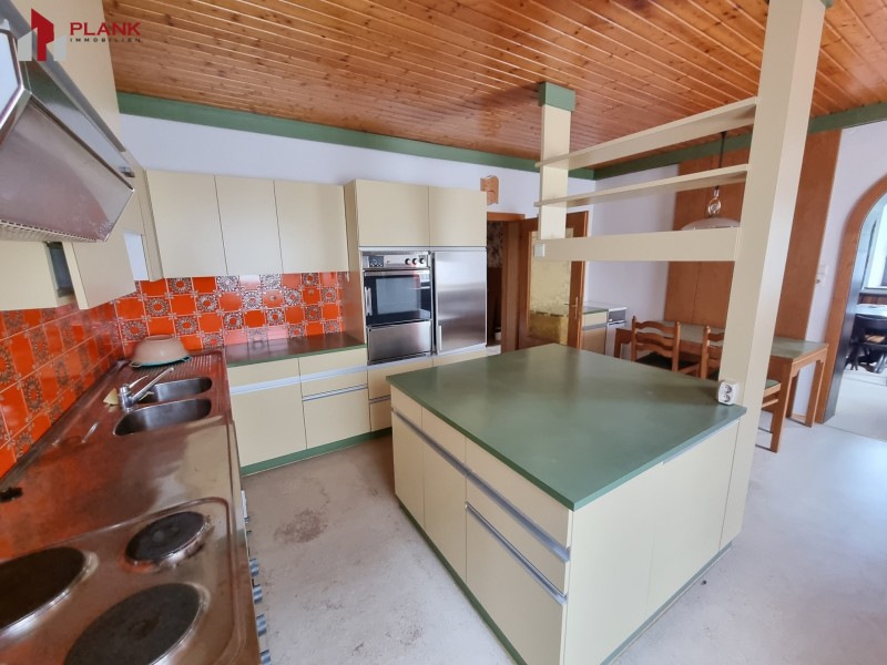 Raumaufteilung: Windfang, Vorraum, geräumige Küche, Esszimmer, Wohnzimmer, Zimmer, Bad mit Dusche und Wanne, WC, Abstellraum.