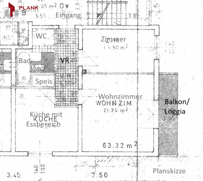 Raumaufteilung: Vorraum, Badezimmer mit Wanne, WC, Küche mit Essbereich und Speis, Wohnzimmer mit Balkon/Loggia, Schlafzimmer, Kellerabteil, Parkplatz.