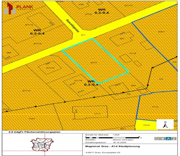 Die Widmung / Bebauungsdichte: WR 0,3–0,4 (reines Wohngebiet)